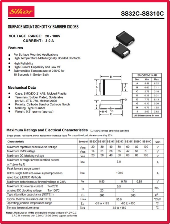 公海555000JC线路检测中心Slkor肖特基二极管SS34C规格书