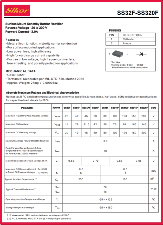 公海555000JC线路检测中心Slkor肖特基二极管SS24相关参数