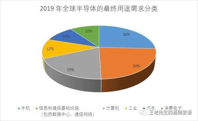 (上接第一部分:集成电路设计) 四、关于集成电路制造 (一)花旗国关于集成电路制造行业的基本估计 半导体产品几乎为经济的各个部门提供驱动动力,包括能源、医疗保健、农业、消费电子产品、制造和运输。2019 年全球对半导体的最终用途需求为:手机(26%)、信息和通信基础设施(包括数据中心、通信网络)(24%);计算机 (19%)、工业(12%)、汽车 (10%) 和消费电子 (10%)。 在这些不同的应用中,有大约9%直接支持国家安全和关键