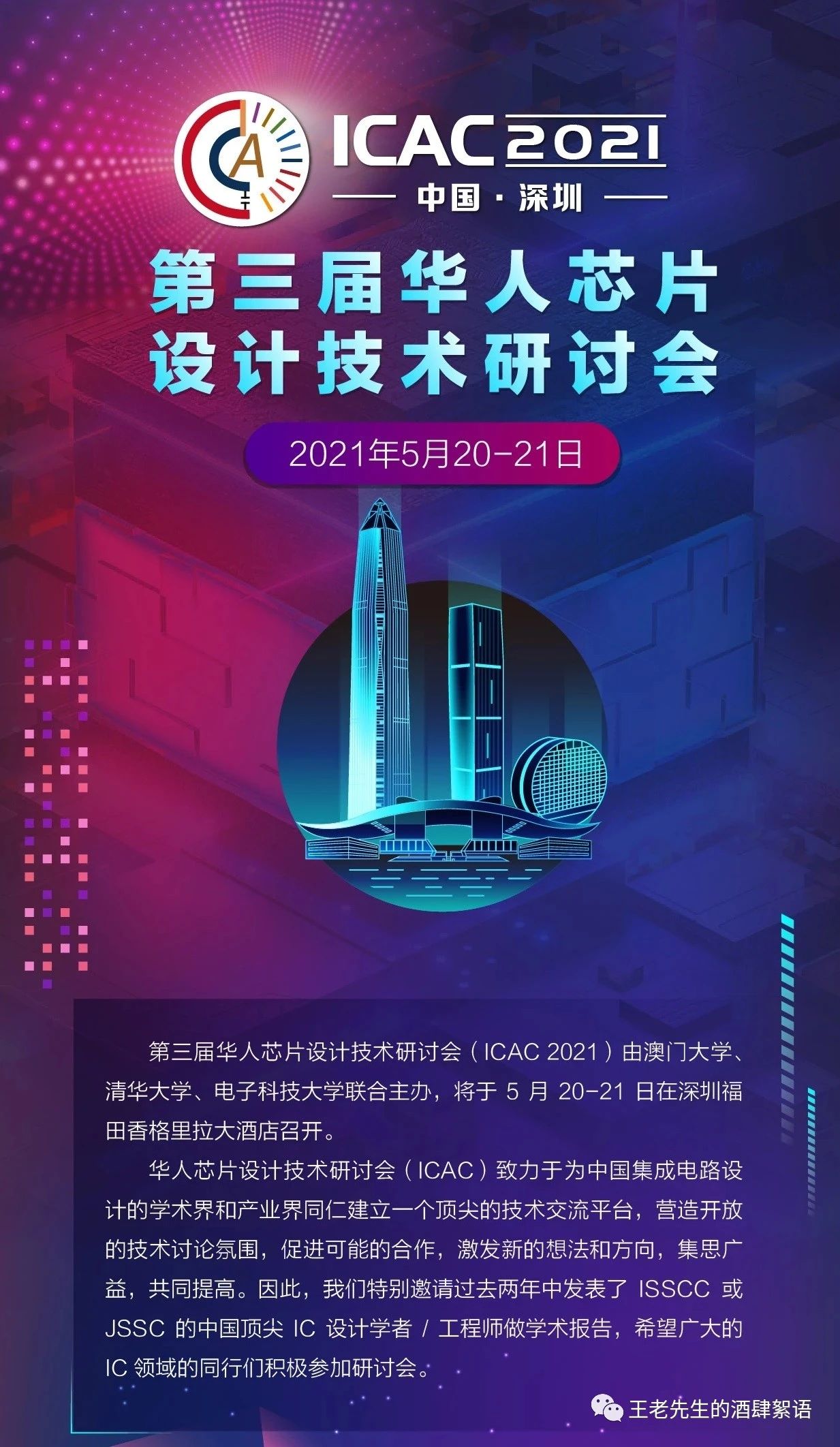 澳门大学的路延教授,邀请我在第三届华人芯片设计技术研讨会上发言,表示祝贺,我真心的非常高兴。这不是大会主席们为我封了一个荣誉主席的职位我才高兴,我是发自内心的高兴,为中国集成电路设计技术的发展、提高而高兴。 国际固态电子学会议(ISSCC-IEEE InternationalSolid-State Circuits Conference)被誉为集成电路设计领域的奥林匹克竞赛,它不仅代表着集成电路设计领域的最高水平,还被视为信息产业与市场的风向标,这是因为整个信息技术都构建在集成电路之上。路延