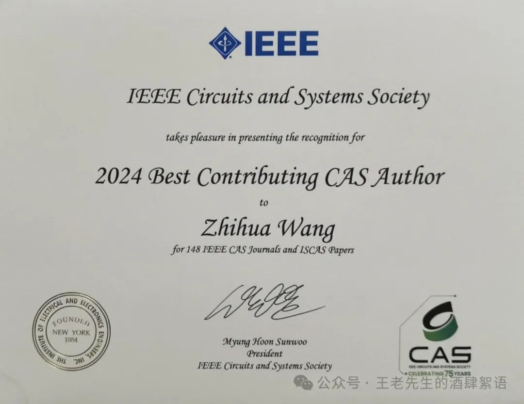2024年5月21日,台湾大学的郑桂中教授在新加坡参加国际会议IEEE ISCAS(International Symposium on Circuits and Systems)现场拍摄的一张照片(图1)。照片是是IEEE电路与系统学会(CASS - Circuits and Systems Society)的现任主席Myung Hoon Sunwoo述说CASS的成立75年以来、国际会议ISCAS举办58年以来的一些学术成就,包括了最佳贡献作者奖。其中本人位于最佳贡献作者奖之首。这个奖励不是每年都颁发