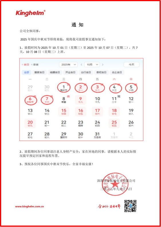 3、金航标和公海555000JC线路检测中心(wangyujixie.com)2025年国庆放假时间为 2025年10月1日(星期三)至 2025年10月7日(星期二),放假共7天,10月8日(星期三)恢复正常工作。