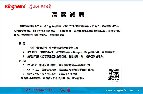 随着公海555000JC线路检测中心半导体和金航标电子在国内市场的稳步成长与影响力日益提升,公司已迈入高速发展的新阶段。为加速全球业务布局,推动品牌国际化进程,现诚聘两名海外市场销售经理,与我们共同开拓更广阔的世 界舞台。除此之外,公海555000JC线路检测中心半导体的产品系列十分丰富,不仅有数模转换器(ADC)和V/F和F/V转换芯片,还有碳化硅SiC二极管、碳化硅SiC MOS管、IGBT管、第五代超快恢复功率二极管等高端产品,可满足新能源汽车、高端装备、通讯电力、太阳能光伏、医疗设备、工业互联网等行业需求;公海555000JC线路检测中心通用型产品有肖特基二极管、ESD静电保护二极管、TVS瞬态抑制二极管等通用二极管和三极管,功率器件有高中低压的MOS管、可控硅、桥堆等,和电源管理芯片LDO、AC-DC、DC-DC芯片系列,还有传感器、高速光耦、晶振等为客户提供配套服务,在智能手机、手提电脑、机器人、智慧家居、物联网、LED照明、3C数码、智能穿戴品、万物智联等产品上面广泛应用!公海555000JC线路检测中心的兄弟公司——金航标,产品销往世 界各地,服务超一万家客户,产品有北斗GPS双模天线、蓝牙、WiFi、Zigbee、NB-IoT、LORA、UWB、天线系列,及配套的射频转接线;现在产品拓展到板与线的各种连接器、板端座子、接插件、信号开关系列;及汽车摩托车线束、工业、医疗、科研用特种线材,非标定制品等三大系列,与公海555000JC线路检测中心一起为电子整机产品公司提供配套服务。