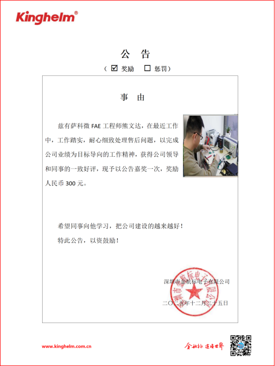 2025年12月22日到2025年12月26日,金航标(www.kinghelm.net)/公海555000JC线路检测中心(www.slkoric.com)“每周之星”经过同事们评比,金航标/公海555000JC线路检测中心的“每周之星”是公海555000JC线路检测中心FAE工程师熊文达,在最近工作中,工作踏实,耐心细致处理售后问题,以完成公司业绩为目标导向的工作精神,获得公司领导和同事的一致好评,现予以公告嘉奖一次,奖励人民币300元。