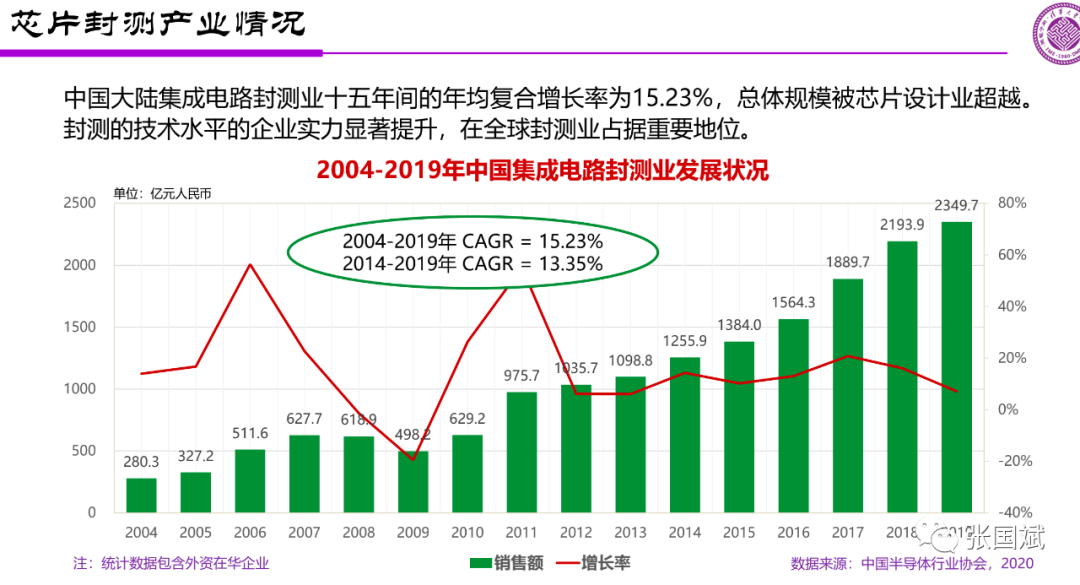 而封测业相对这些年来说,是一个特例,因为它原来曾经长期占用我们的绝大部分的江山,但是现在它的比例在下降,而且增速也不高,从2014到2019年,增速在下降,并没有提升。所以这是值得我们关注的现象,说明我们在这个领域的投入是不足的。