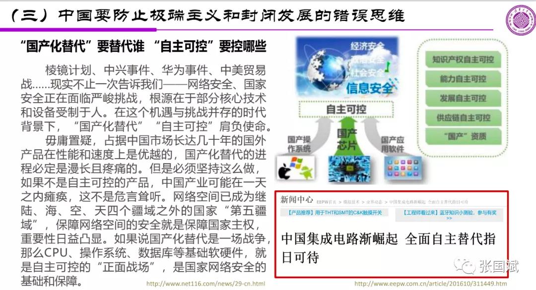 我们已经融入了全球技术体系,除了下一代技术,量子技术、5G、太空等等,这个东西因为还没有形成一种国际标准,或者国际技术体系,在其它的电子元器件、电动汽车、消费类电子、设备、人工智能,我们几乎都是国际标准、国际技术体系的重要的组成部分。所以我们不可能离开国际的全球技术体系,去走回头路另搞一套,这是不可能的事情。同时我们也看到,无论是光伏面板、高铁、数字支付、智能手机、云服务、机器人,我们国内市场占有率都超过50%,你要技术发展,只是能够走向全球,所以全球化,如果不走到外面去怎么发展壮大,所以除了半导体,我们其它的也都需要走向国际,所以国际化是我们大的方向,必须坚持。