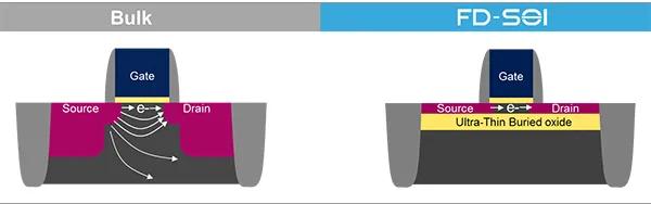全耗尽型绝缘体上硅(FD-SOI)是一种平面工艺技术,它依赖于两项主要技术创新。首先,在衬底上面制作一个超薄的绝缘层,又称埋氧层。然后,用一个非常薄的硅膜制作晶体管沟道。因为沟道非常薄,无需对通道进行掺杂工序,耗尽层充满整个沟道区,即全耗尽型晶体管。这两项创新技术合称“超薄体硅与埋氧层全耗尽型绝缘体上硅”,简称UTBB-FD-SOI。