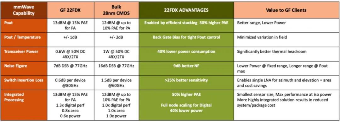 此外,在汽车电子领域,22FDX平台也颇受欢迎,该平台将毫米波性能与数字集成一体,支持77GHz以上的高分辨率雷达。这是对于汽车雷达的“甜蜜点”,因为一流的RF性能与出色的数字集成相结合,能够显著改进成像分辨率和精确度。