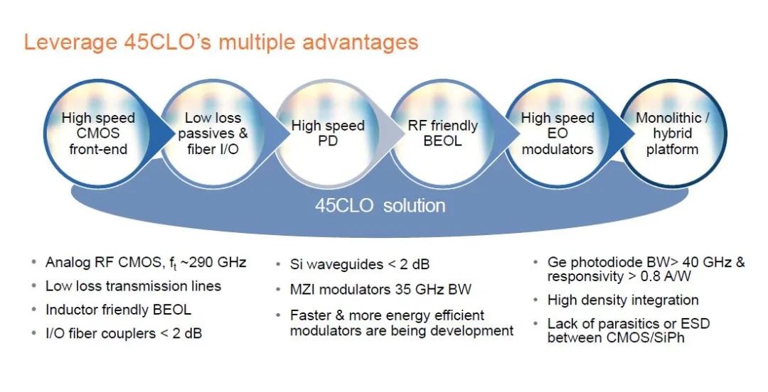 格芯的45CLO工艺是整合数字RF功能与所需的光学器件的硅光单芯片解决方案。(资料来源:格芯)