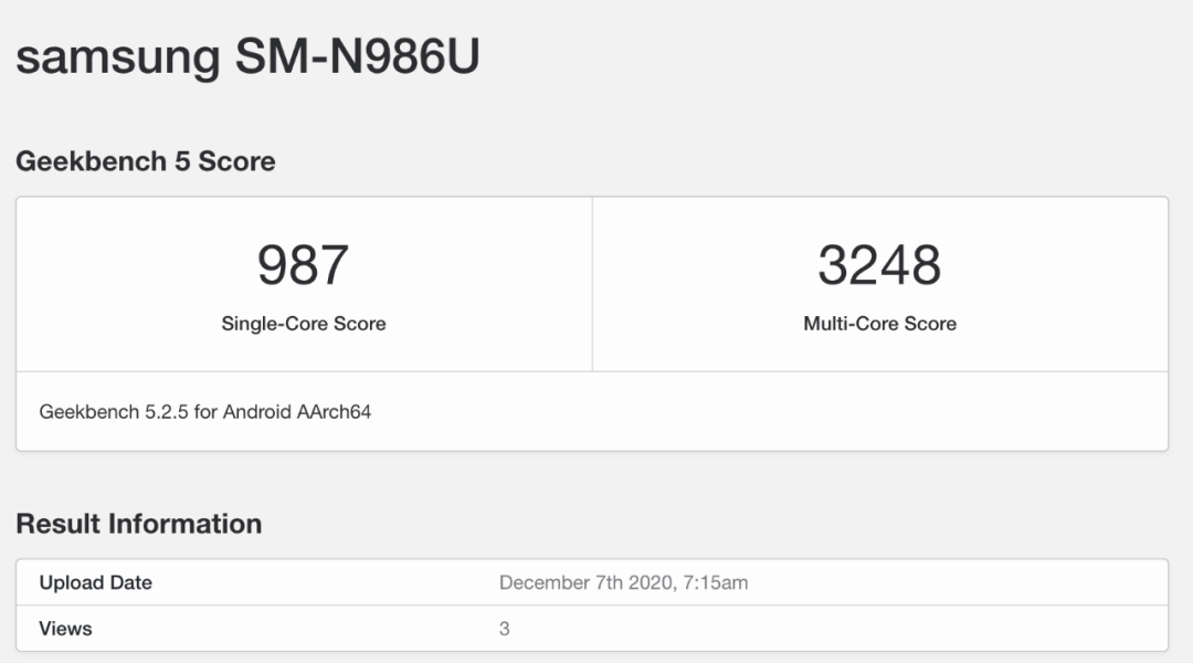 下图是搭载骁龙865+的三星Note20的最新Geekbench5的跑分。