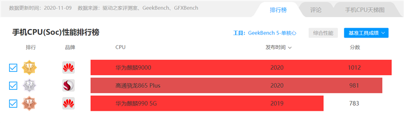 这是麒麟9000与骁龙865+以及麒麟990 5G SoC对比