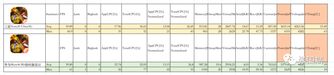 再看看《王者荣耀》,从数据看,华为Mate40 RS保时捷设计帧率还是稍高于三星Galaxy Note 20 Ultra 的,而且功耗要低不到10%,最关键的是华为手机的CPU温度只有19度,而三星的要到40多度了。