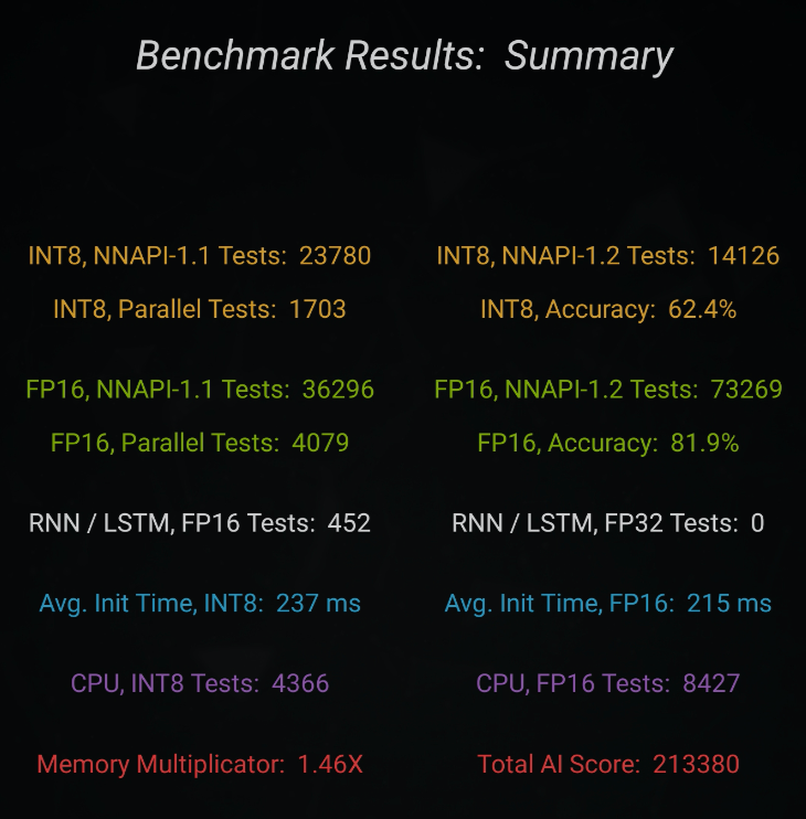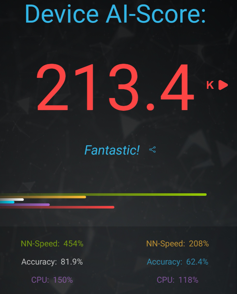 这是AI Benchmark测试分,华为Mate40 RS保时捷设计得分213K ,远高于骁龙865+的88K左右的得分。
