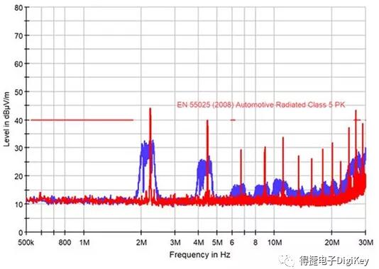 图2:使用固定基本频率(红色)的开关稳压器与采用频率抖动(蓝色)的稳压器辐射发射频谱对比。工作参数:fOSC = 2.2MHz,VIN = 12V,VOUT= 3.3V,负载 = 3A。(图片来源:Allegro Microsystems)