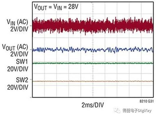 图3:在直通模式下,即使面对高噪声输入源(红色迹线),LT8210稳压器亦可减小输出电压纹波(蓝色迹线)。(图片来源:Analog Devices)