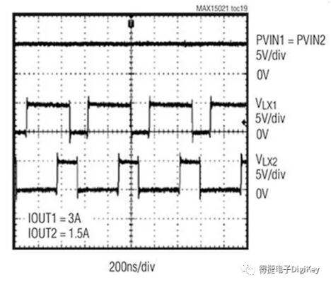 图5:MAX15021双通道稳压器可实现180&deg;异相工作以抑制EMI。(图片来源:Maxim Integrated)