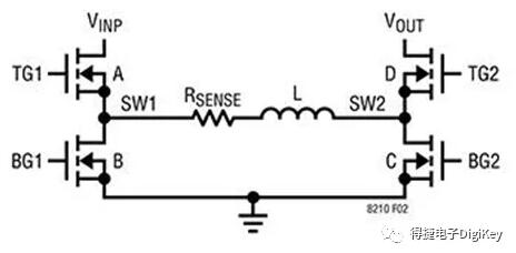 VIN在VOUT(BOOST)与VOUT(BUCK)之间时,输出电压追踪输入电压。一旦VOUT趋近于VIN,LT8210就会进入低功耗状态(直通模式),即开关A和D持续导通,而开关B和C关断。VOUT超出VIN达到设定百分比时,开关A、C 和 D关断,直至放电使输出电压与VIN几乎相等时,才重新连接输出。如果处于(非开关)直通窗口内时输入出现正瞬变,使得VIN超出VOUT达到设定百分比,则开关将重新导通,以防电感器电流中出现较大幅度瞬时振荡。此时,输出电压将逐渐接近输入电压,方式类似于软启动,而VOUT趋近于VIN时,开关A和D将再次持续导通。开关拓扑如图4所示。