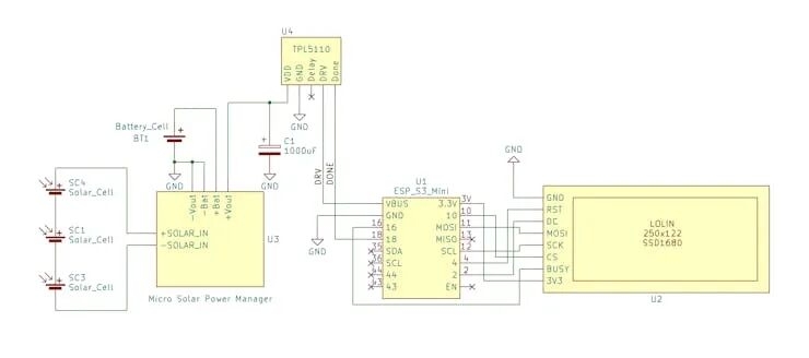 电源链路:太阳能板 → SPV1050 → 电池 → TPL5110 →(系统电源)→ ESP32-S3 & 墨水屏。