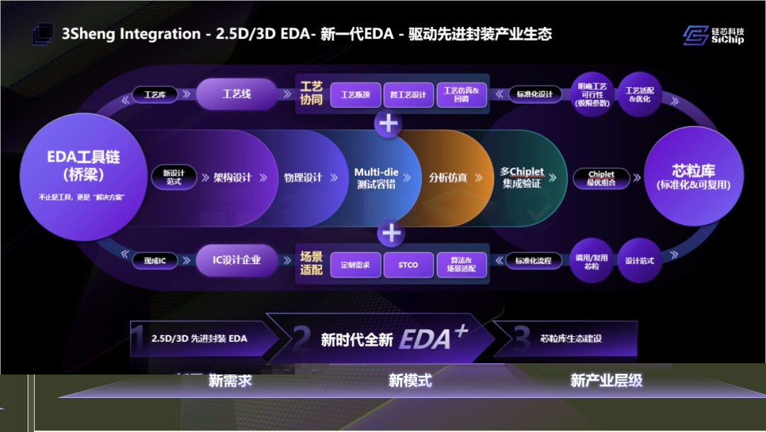 从硅芯科技在会上披露的思路来看,EDA+可以概括为一条完整链路:以“2.5D/3D 全流程先进封装 EDA 工具链”为桥梁,一端深度对接工艺协同,另一端面向多 Chiplet 集成验证的应用场景,实现从系统架构规划、物理实现、多物理场仿真到制造验证的工程闭环。EDA⁺不是一套“软件产品组合”,而是一种面向 Chiplet 与 3DIC 的新设计范式。