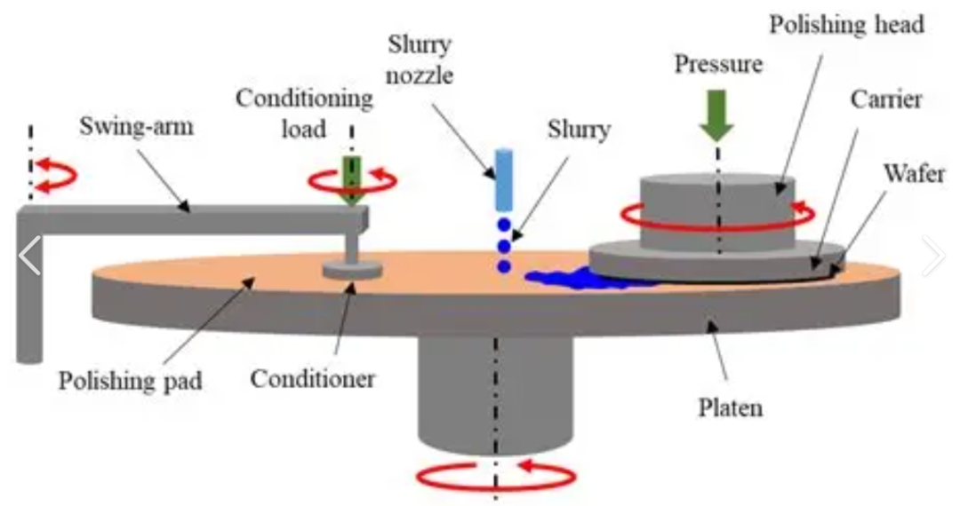 CMP = Chemical Mechanical Polishing(化学机械抛光),也叫化学机械平坦化。