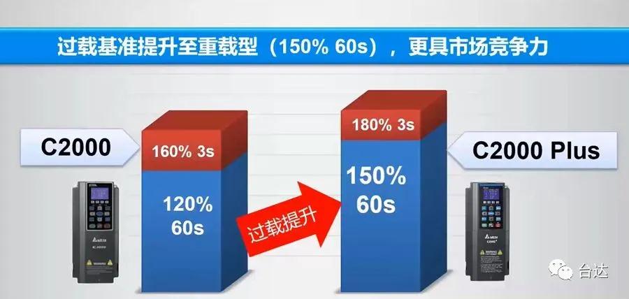 过载能力的大幅强化,是C2000+最关键的性能提升之一。也这是标准型变频器在市场应用中最被关注的指标之一。原本台达C2000可实现标准模式下负载120% 60秒,负载150%3秒;重载模式下可负载150%60秒,负载180%3秒。这已经超出了欧美主流泛用型变频器的性能。不过,在实际操作中仍然会有一些应用场景需要放大一档选型。