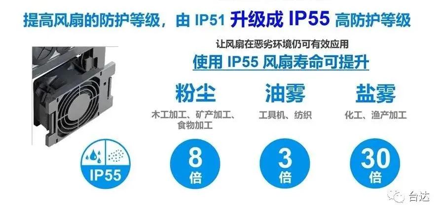 首先,C2000+将C2000原先IP51的散热风扇提升至IP55等级,不止散热性能进一步加强,对于粉尘、油雾、盐雾等的防护能力也有3-30倍的提升。而采用更大间距的抛光散热片,进一步减少了灰尘棉絮的堆积。再配合C家族经典的散热背板外伸至柜体外部的安装方式,让散热和防护效果整体更加出色。