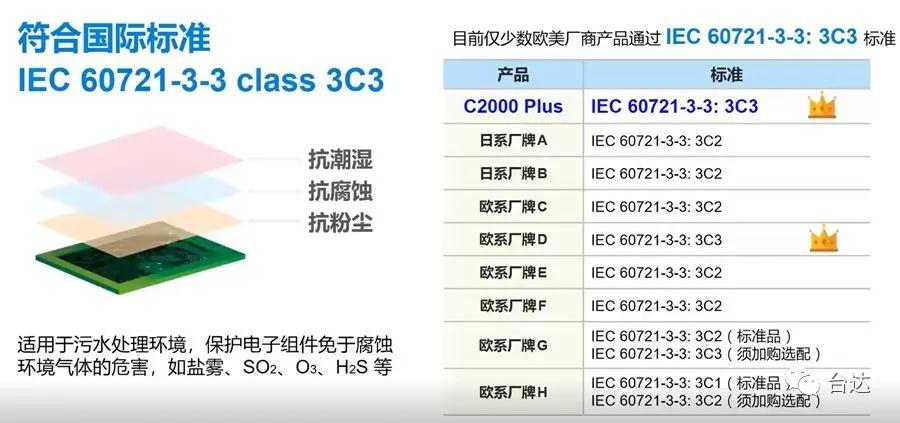 同时,C2000+采用了强化PCB板涂层,符合国际标准IEC60721-3-3class 3C3标准。能够保护电子组件免于腐蚀环境气体的危害,在提升C2000+防护力的同时,也拓展了其在污水处理等恶劣环境和特殊场景中的应用。