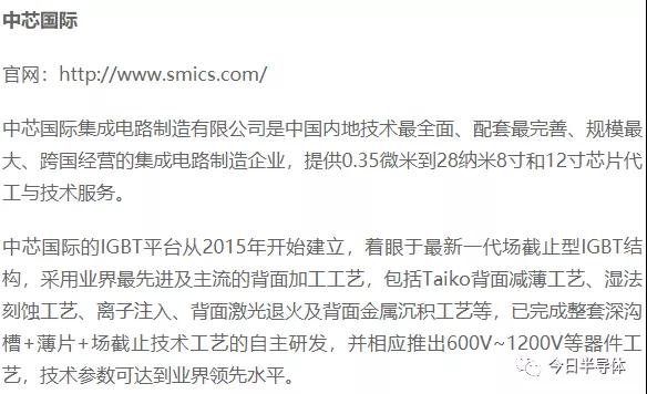 吉林华微电子股份有限公司成立于1999年,集功率半导体器件设计研发、芯片加工、封装测试及产品营销为一体,官网信息显示其拥有4英寸、5英寸与6英寸等多条功率半导体分立器件及IC芯片生产线,芯片加工能力为每年400万片,封装资源为24亿只/年,模块360万块/年。 今年4月,华微电子拟募投8英寸生产线项目,600V-1700V各种电压、电流等级IGBT芯片是该项目的重点之一。