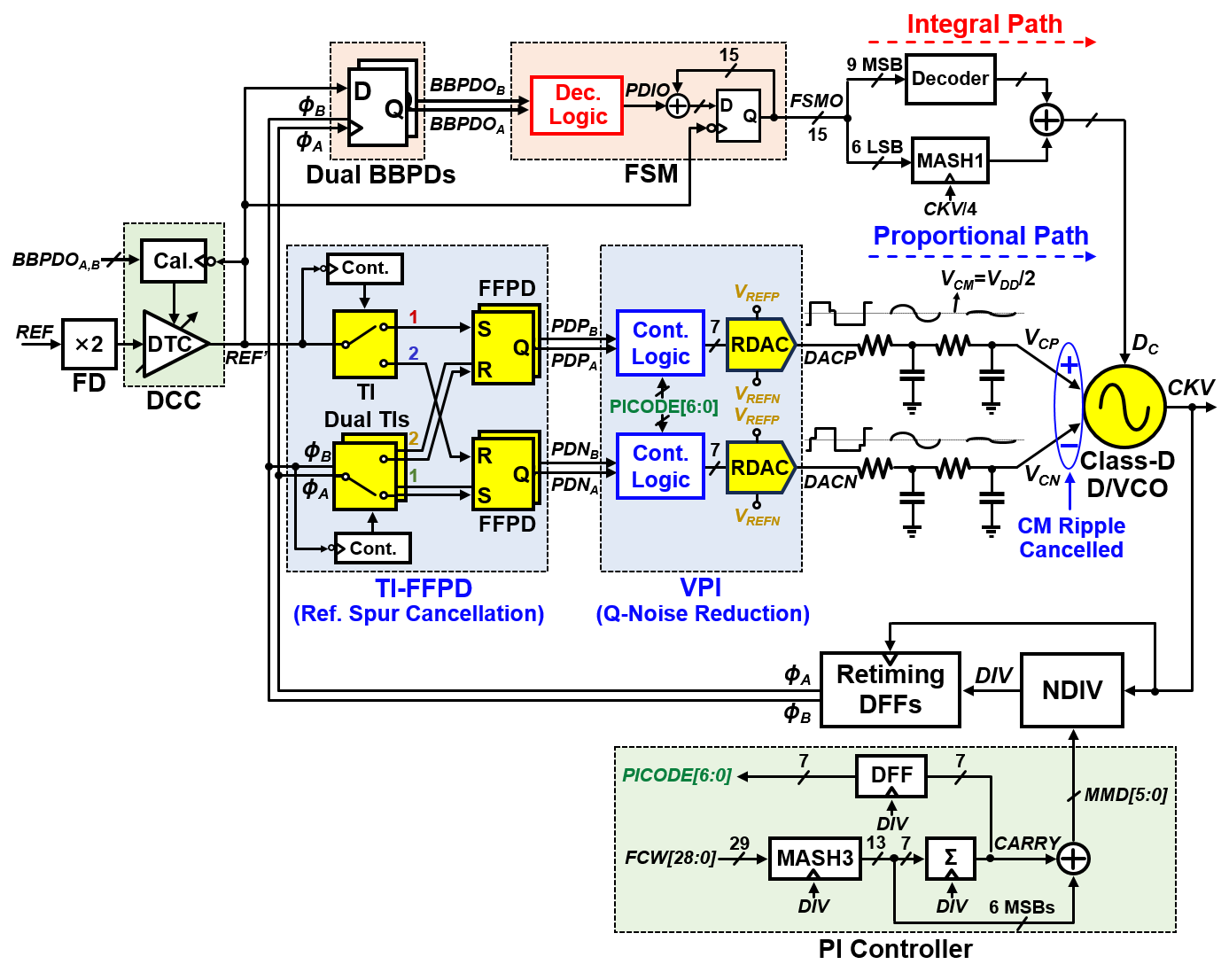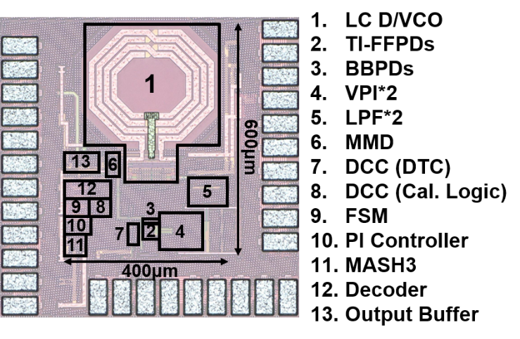 低电压锁相环对实现低功耗数字系统的动态电压调整以及物联网设备的无线能量收集供电具有重要的意义。整数型锁相环芯片已经可以实现低于0.4V的电源电压,但是,由于传统的鉴相器和量化噪声消除方法的性能在低电压下受到严重影响,目前报道的最低供电电压的CMOS分数型锁相环采用0.5V电压供电,且需要内置升压模块。针对以上问题,研究团队提出了一种基于电压模的相位插值器,该方法通过一个电阻型数模转换器(RDAC)在电压域实现量化噪声补偿。由于其量化精度依赖于无源元器件(电阻)的比例,其在0.5V电源电压并考虑PVT变化的条件下实现了<0.15 LSB的线性度,且无需进行增益和线性度的校准。基于该电压模相位插值器以及时钟交织的触发器型鉴相器(TI-FFPD),团队在28nm CMOS工艺下实现了一款工作在2.4GHz的无偏置电流的混合型分数锁相环。该锁相环在0.45V电压下实现了小于600fs的积分抖动以及-57dBc的最差杂散,功耗为0.72mW,且无内置升压模块。该工作以“A 0.45V 0.72mW 2.4GHz Bias-Current-Free Fractional-N Hybrid PLL Using a Voltage-Mode Phase Interpolator in 28nm CMOS”为题发表在ISSCC’24。集成电路学院博士研究生冯礼群为论文第一作者,团队的李宇根教授为论文通讯作者。