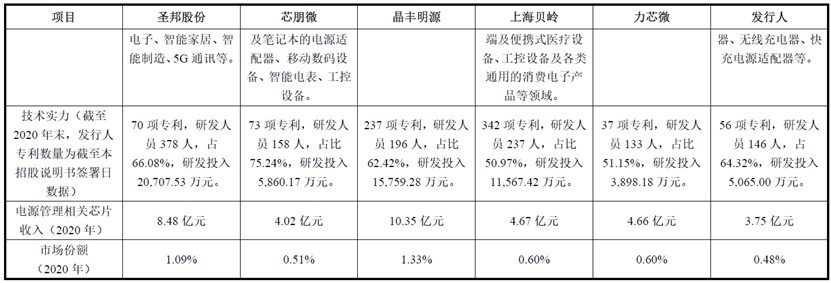 电源管理芯片因为是通用器件,而且设计和制造工艺技术相对成熟,因此这一市场的国产芯片厂商很多(跟MCU市场类似),下表将英集芯(表中发行人)与其它已经上市的五家国产电源管理芯片公司进行了对比。
