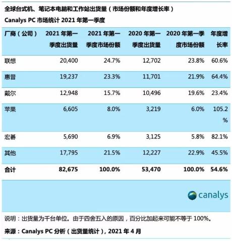 Canalys 4月15日发布最新数据显示,2021年第一季度,全球PC市场保持增长势头,台式机和笔记本电脑(包括工作站)的出货量年同比增55%,该季度8270万台的总出货量是2012年以来最高的第一季度出货量。