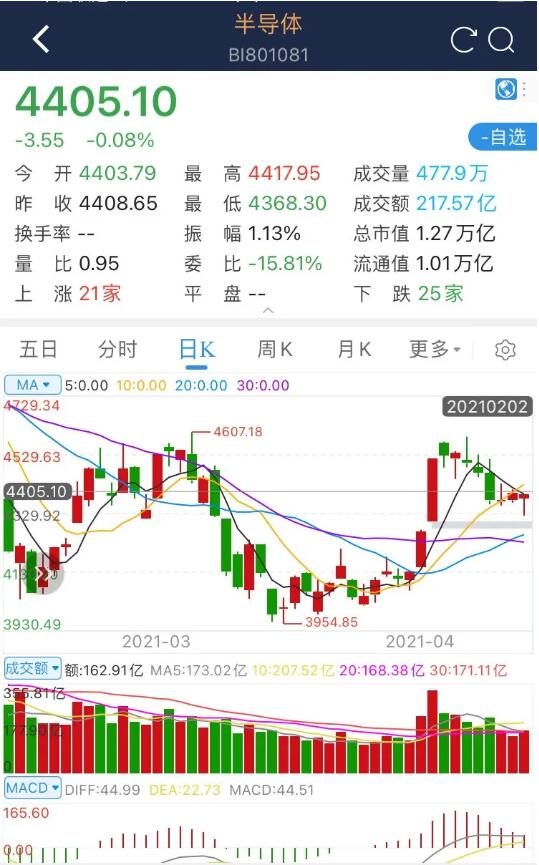海通半导体(BI801081)指数今日(4月15日)收盘指数为  4405.10 ,跌幅为  0.08% ,总成交额达217.57亿。其中上涨  21 家, 下跌  25 家。