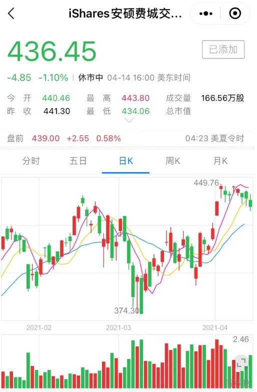 腾讯自选股数据显示,4月14日美股半导体指数ETF(SOXX.US)收盘价格为436.45美元,跌幅为1.10%,总成交量达166.56万股。