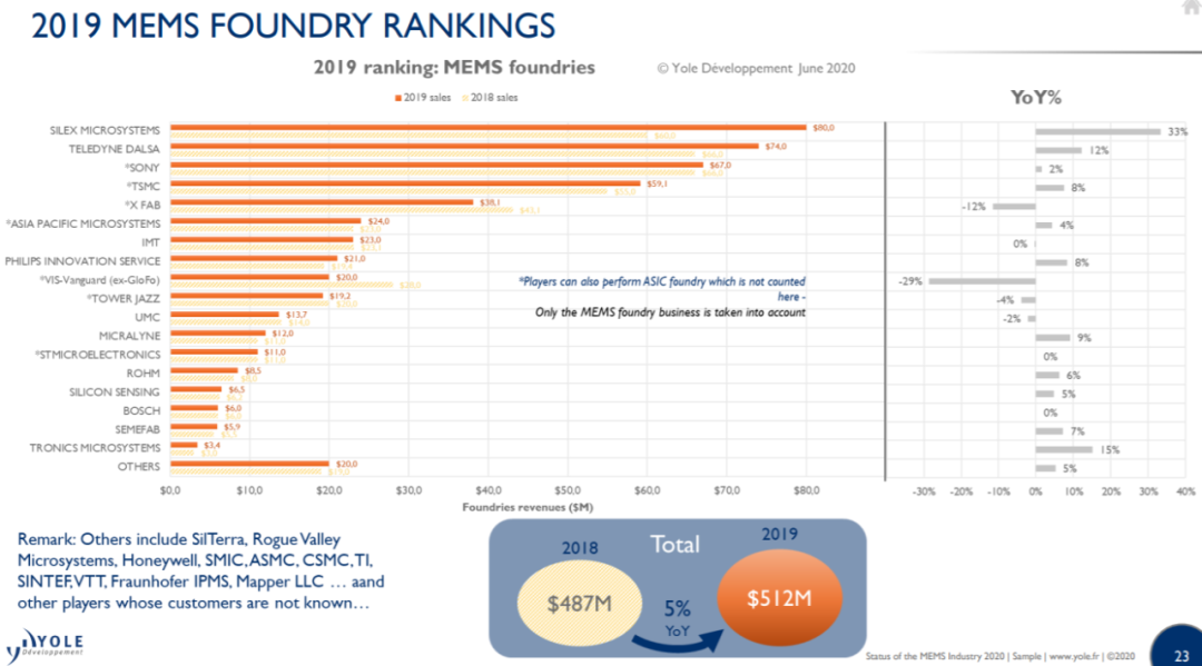 2019年的MEMS Foundry销售额排行榜。一般情况下,MEMS Foundry也兼具半导体Foundry的功能,此处仅仅是MEMS Foundry的销售额统计。(图片出自:Yole Développement)