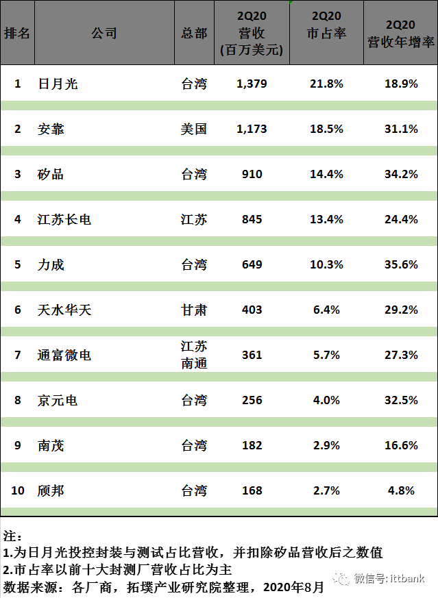 2020年第二季全球前十大封测业者营收预测排名