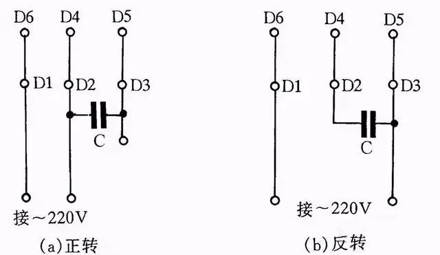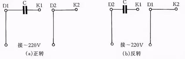 图4是JX07A-4型单相电容运转电动机接线方法。电动机功率为60W,用220V/50Hz交流电源、电流为0.5A。它的转速为每分钟1400转。电容选用耐压400~500V、容量8μF的产品。图4(a)为正转接线,图4(b)为反转接线。