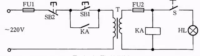 工作原理:闭合S后,按下按钮SB1,变压器得电输出36V低电压,使得继电器或交流接触器KA吸合。放松按钮SB1后,KA自锁触点使KA保持吸合,继续给变压器接通电源。如果变压器次级发生短路故障,继电器线圈电压为零,此时KA便失电释放,将变压器电源断开,保护变压器不被破坏。