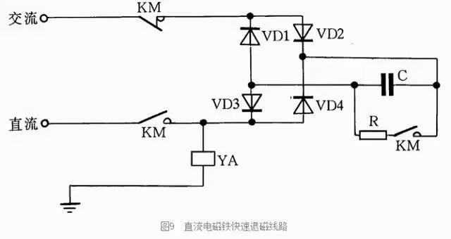 直流电磁铁停电后,因有剩磁存在,有时会造成不良后果。因此,必须设法消除剩磁。图9中,YA是直流电磁铁线圈,KM是控制YA启停的接触器。KM吸合时,YA通电励磁;KM复位时,YA断直流电,并进行快速退磁。