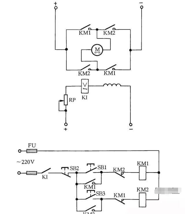 在励磁电路内,串联一个欠电流继电器KI,其常开触点接在控制电路中。当励磁电流消失或减小到设定值时,KI释放,KI常开触点断开,切断电动机电枢电源,使电动机停转,从而避免超速现象发生,见图11。