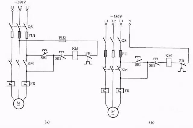 接触器线圈电压为380V时,可按图12(a)所示接线;接触器线圈电压为220V时,可按图12(b)接线。图12(a)的接线还有缺陷,即在电动机停转时,其引出线及电动机带电,使维修不大安全。因此,这种线路只能在应急时采用,并在维修电动机时,应断开控制电动机的总电源开关QS,这一点应特别注意。