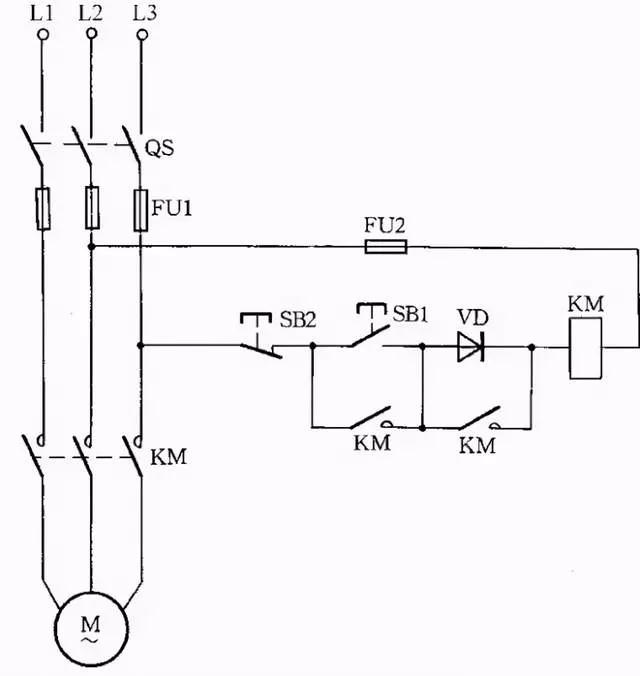 因为启动电流较大,所以这种线路只适用于操作不频繁的场合。线路中,VD应选用耐压大于700V的二极管,电流要根据交流接触器线圈电流而定。