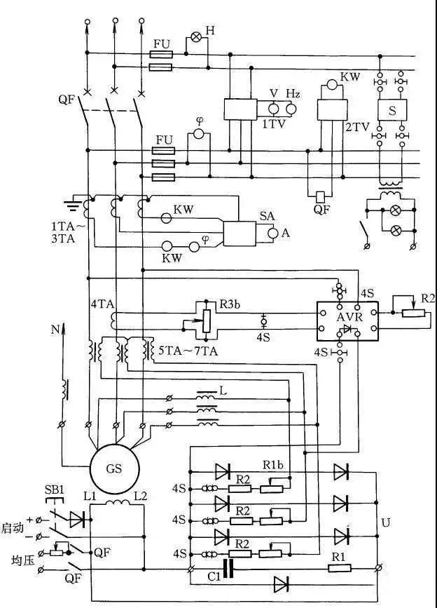 HF-4-81系列发电机控制线路如图15所示,它与T2XV系列小型三相同步发电机配套。同步发电机的励磁系统采用电复合相复励调压。发电机端电压经线性电抗器L移相,然后与发电机负荷电路中的电流互感器5TA~7TA二次电压合成,经三相桥式整流器整流后,供发电机GS励磁自动调压。