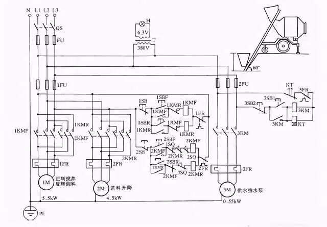 加水完毕即可实施搅拌。按下1SBF正转按钮,1KMF得电吸合,1M正转搅拌,搅拌完毕后按下1SB停止按钮即可停止。出料时,按下1SBR按钮,1M反转即可把混凝土泥浆自动搅拌出来。然后按下1SB,接触器1KMR断电释放,1M停转,出料停止。