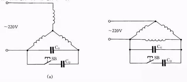 如图19所示:图(a)为Y形接法电动机连接方法,图(b)为△形接法电动机连接方法。为了提高启动转矩,将启动电容CQ在启动时接入线路中,在启动完毕后退出。