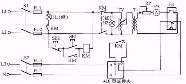热继电器校验台如图20所示,它主要由调压器TV、降压变压器T、电位器RP、410型毫秒表等元件组成。