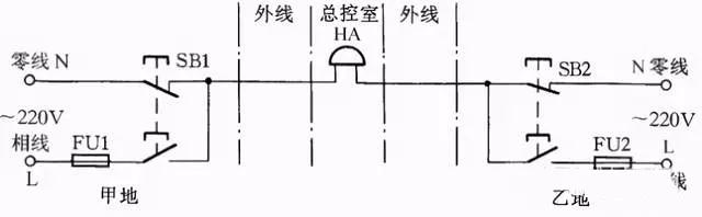 图23所示线路可使甲乙两地都能向总控制室发联络信号。当甲地向总控制室发信号时,按下按钮SB1,控制室的电铃告警。同理当乙地向总控制室发信号时按下SB2即可。甲乙两地信号可用信号铃声的时间长短或次数区分。