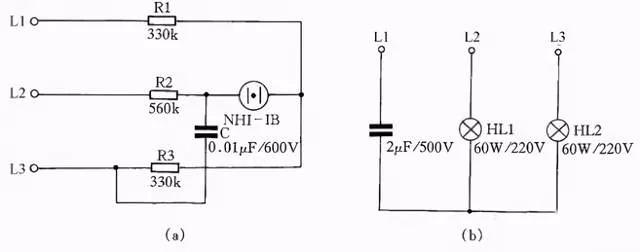 用电阻、电容、氖泡可组成一小型电源相序指示器。当电源按顺相序L1、L2、L3接入时,氖灯就亮;按逆相序L2、L1、L3接入时则氖灯不亮。线路如图25(a)所示。