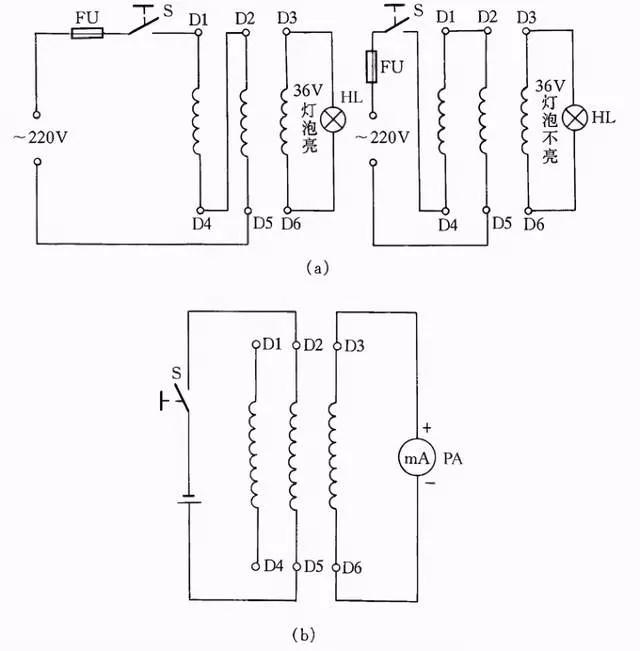 用交流电源和灯泡确定电动机三相绕组的方法是:首先用36V低压灯做试灯,分出电动机每一相线圈的两个线端,然后将两相线圈串接后通入220V电源,剩下的一相线圈两端接36V的灯泡线路通入电源后,灯泡发亮,说明所串联的两相是头尾相接;灯泡不亮,说明是头头相接,如图26(a)所示。然后将测出的两相线圈头尾做一标记,再按此方法将其中一相与原来接灯泡的一相线圈串联,另一相连接灯泡,再按同样道理判断,电动机三相绕组的头尾就很容易区分出来了。
