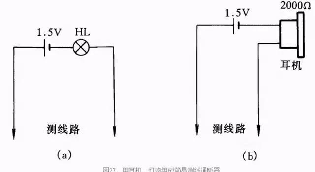 图27(a)、(b)是最简便的线路通断检测器。当测得导线通路时,灯泡会发光,耳机在通断瞬时会发响;当线路断路时,耳机不响,灯泡不亮。这种方法简单易行,非常适合初学电工制作工具仪表或代替万用表做测量,其优点是携带方便。