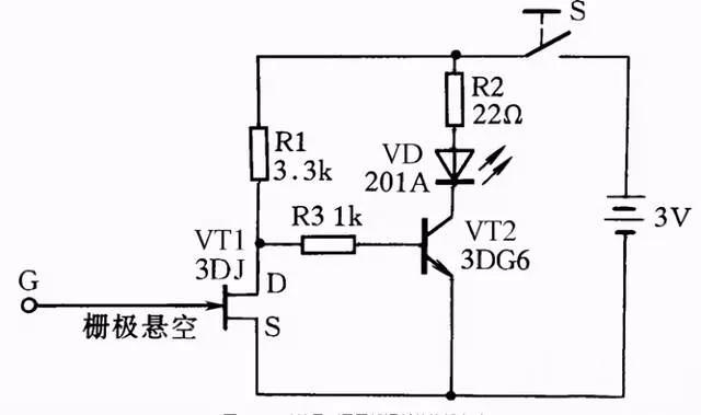 图28所示是一感应测电笔线路。它可方便地测出导线的断芯位置。在用来测导线断芯位置时,在导线一端接上220V的电源相线,然后用感应测电笔的探头栅极靠近被测导线,并沿线移动。如果发光二极管在移动中突然熄灭,那么此处便是导线断芯位置。